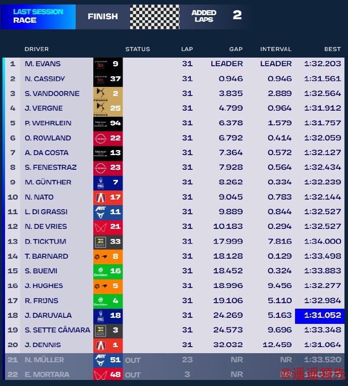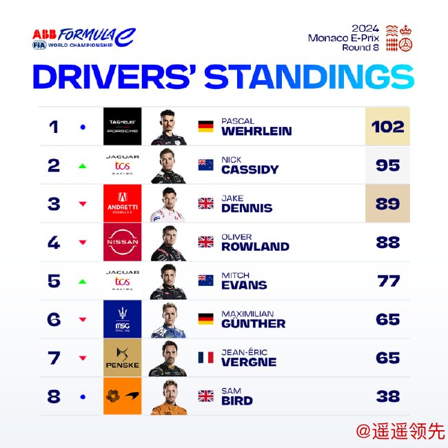 2024FE电动方程式锦标赛第8回合在摩纳哥举行,捷豹车队凭借出色的团队配合包揽冠亚军,kiwi组合再次在摩纳哥携手登台,范多恩收获在DS潘世奇车队的首个领奖台。捷豹、DS、保时捷、日产4家制造商车队双积分完赛,19位发车的诺曼·纳托收获积分巴纳德在首场FE比赛中收获第14名壹号娱乐下载,位于队友身前。