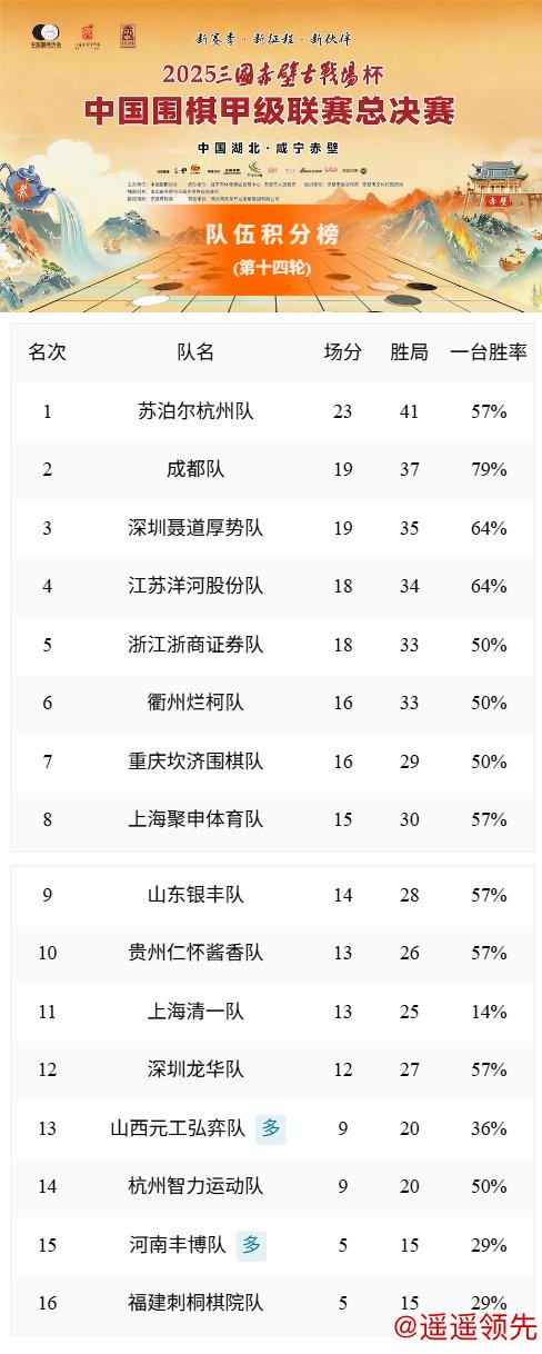 2025三国赤壁古战场杯中国围棋甲级联赛第十四轮赛果: